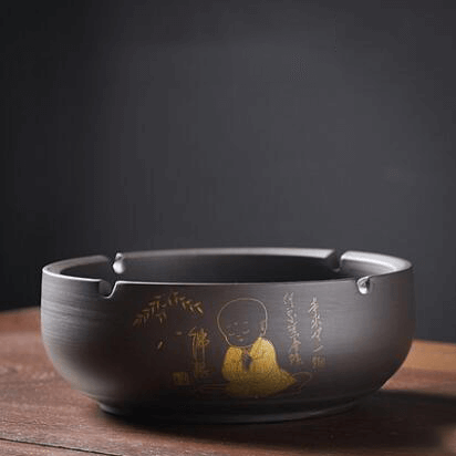 Magnifique cendrier asiatique en argile orné d'un dessin doré représentant un petit moine en train de prier.
